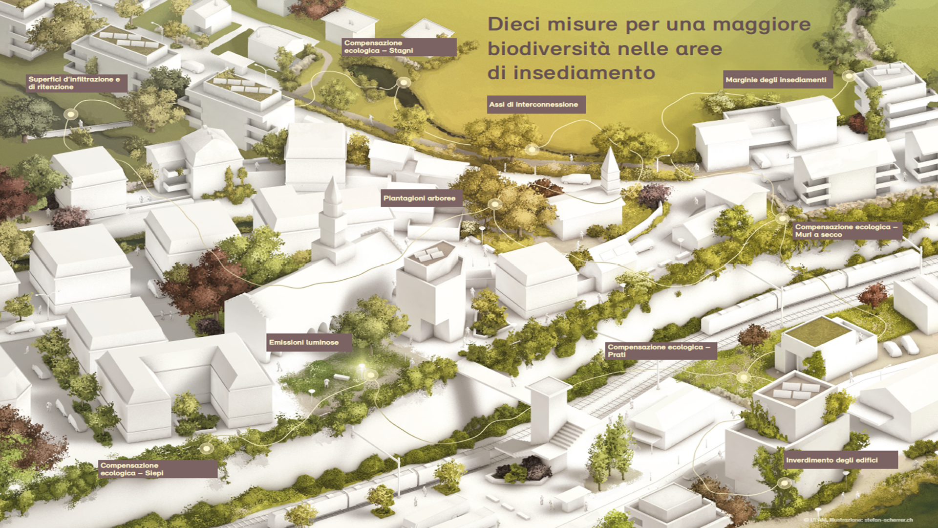 La pubblicazione del Ufficio federale dell'ambiente (UFAM) «Biodiversità e qualità del paesaggio negli insediamenti. Modelli di disposizioni raccomandati a Cantoni e Comuni» sostiene l’impegno dei Cantoni e dei Comuni volto a ripristinare l’assetto naturale degli insediamenti migliorandone l’attrattività.